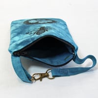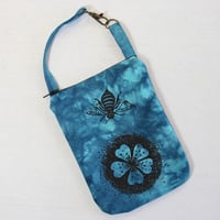 Made of hand dyed organic cotton, this phone sized purse has been screen printed in black textile paint with an image of a honey bee and a cherry blossom on a hand dyed teal blue background.